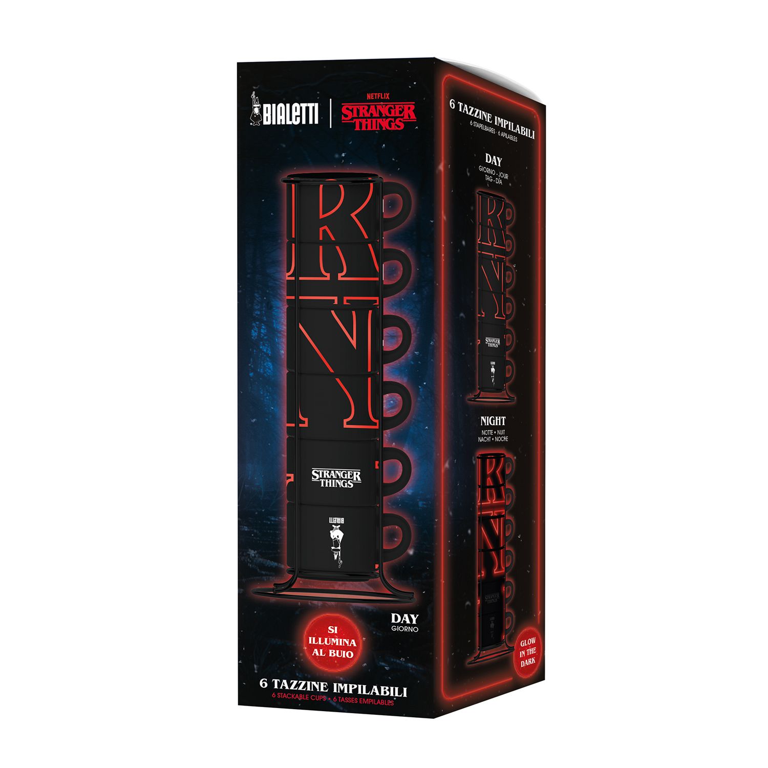 Among the glow-in-the-dark products, the set of stackable Bialetti cups is a must-have. Six black espresso cups stacked one on top of the other are covered with the iconic Stranger Things letters. The glow-in-the-dark effect makes the red text light up, recreating the iconic Stranger Things letters.