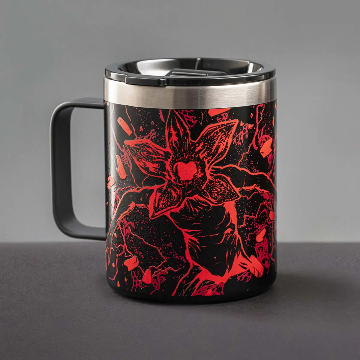 The product is double wall to ensure better temperature retention. Its handle makes it perfect to take along on outdoor activities. The glow-in-the-dark effect makes it unique. The Demogorgon lights up in blue, for an amazing coffee break.