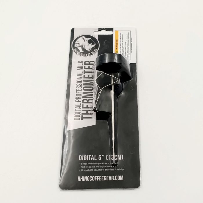 How do you use it? Insert the stem of the thermometer through both holes in the clip. Pressing the clip together will allow for easier positioning along the thermometer stem. Push the clip down onto the side of the pitcher and position it until the stem tip is sitting just above the bottom of the pitcher. Set your desired temperature for an audible alarm or just read the display for the desired temperature. It’s important to remember to always position the Rhino Coffee Gear Milk Thermometer on the pitcher before filling to ensure you have it seated at the correct height. Before and after each use, always clean the thermometer stem.