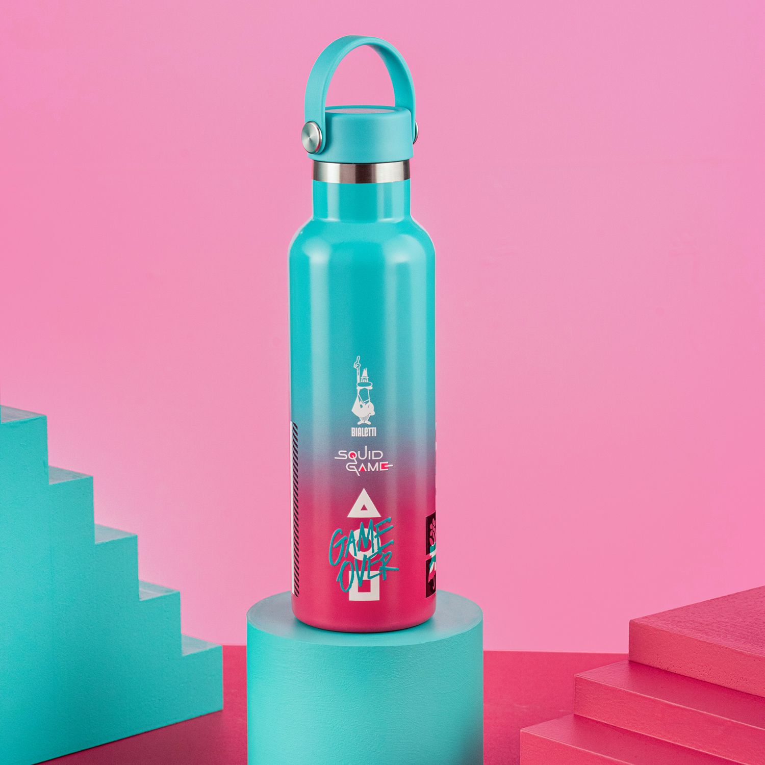 Među novitetima nove kolekcije Squid Game Bialetti za Netflix, postoji novi asortiman pribora dvostrukih zidova od nerđajućeg čelika, savršenih za nošenje omiljenih pića sa sobom,kao sto je termalna boca u potpunosti ukrašena temom Squid Game: od nijansi do geometrijskih detalja, svaki detalj savršeno podseća na izazove serije. Pogodan za nošenje sa sobom zahvaljujući prisustvu kuke, garantuje otpornost na 24 sata hladnoće i 12 sati toplote.