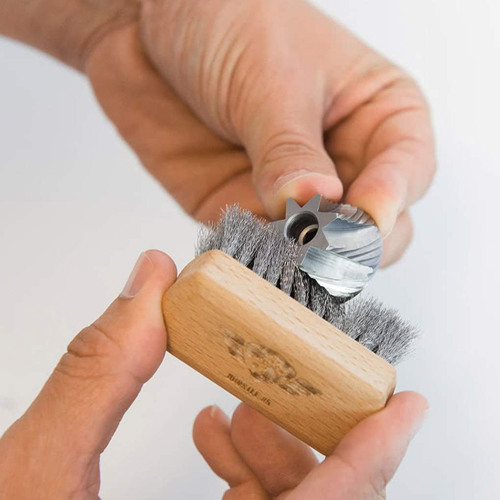 Mala četka se sastoji od drške od bukve i mnoštva čekinja od nerđajućeg čelika koje su srednje tvrde na dodir.
