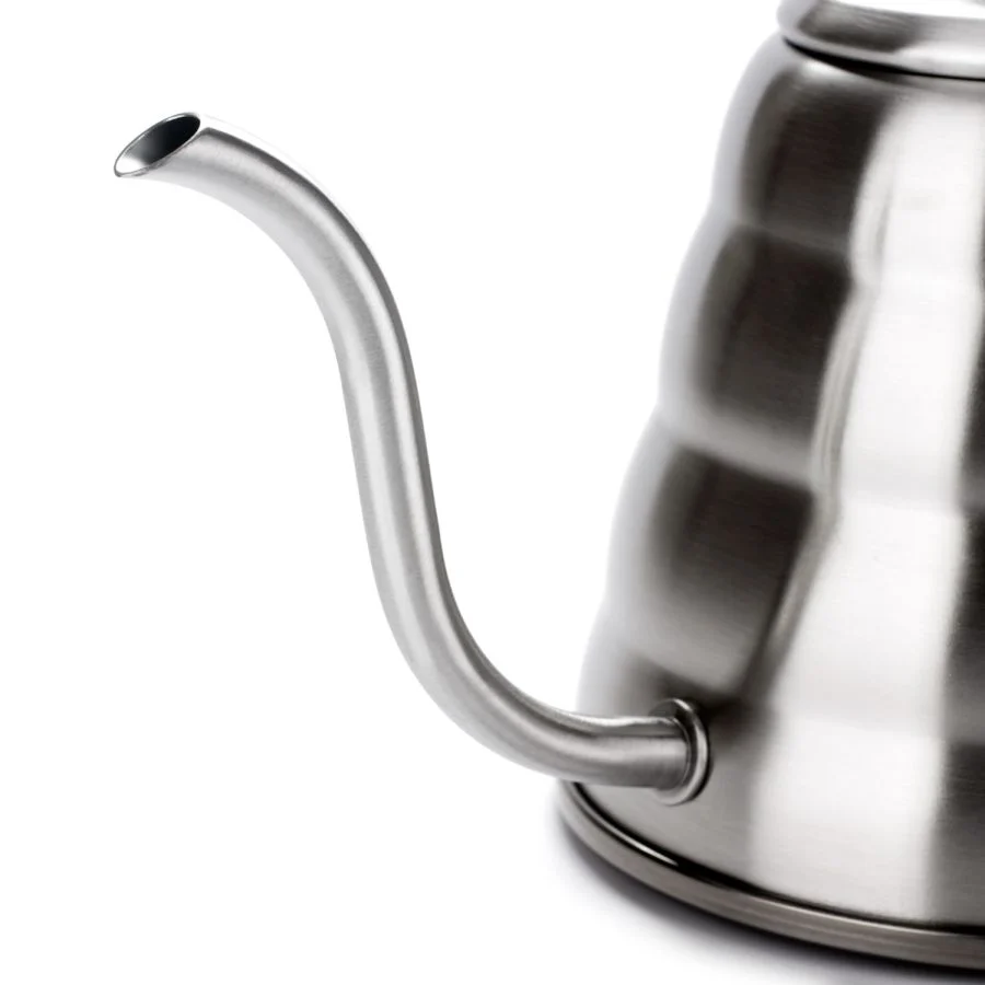 Hario Buono ketl/čajnik za vodu izgleda odlično, odlično se koristi i sipa vodu sa preciznošću kao nijedan drugi čajnik. V60 Hario čajnik je dobro dizajniran kotlić koji ima klasičan izgled i kombinuje kontrolu i stil na izuzetan način. Hario Buono čajnik je posebno dizajniran da vam pruži potpunu kontrolu tokom procesa prelivanja. Ima veoma lagano telo od nerđajućeg čelika što ga čini lakim za rukovanje, a takođe je higijenski i izdržljiv. Buono čajnik će raditi na svim vrstama šporeta, uključujući indukcione (ali samo ako koristite indukcioni adapter). Bez obzira da li ste profesionalni barista ili jednostavno želite da kuvate kafu kao profesionalac kod kuće, Buono čajnik je neophodan i svaki put će vam dati pouzdane rezultate.
